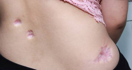 Hình ảnh thương tổn sau khi tiêm điều trị sẹo lồi ở lưng của bệnh nhân A trước khi đến Bệnh viện Da liễu Trung ương